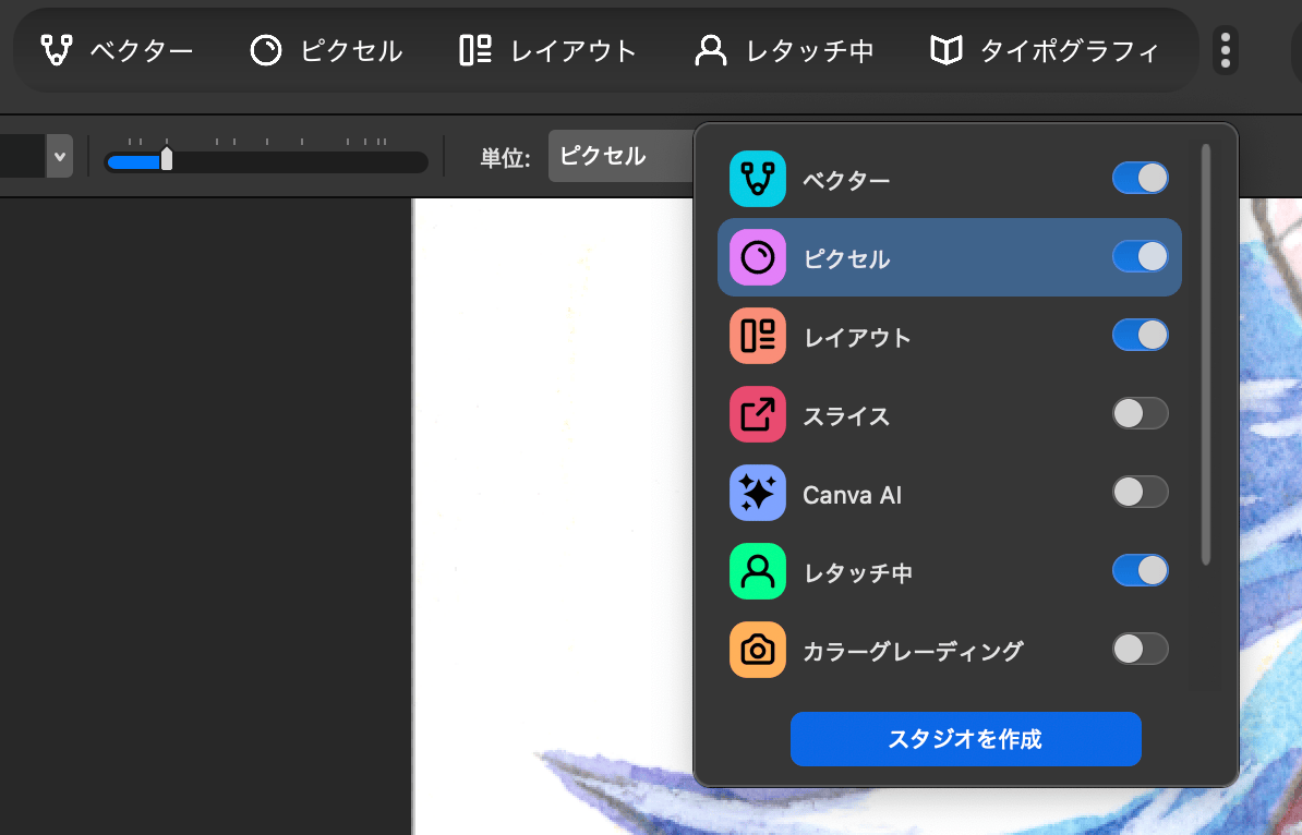 モードのオンオフ設定は、スタジオツールボタンの一番右にある3点コロンを押すと呼び出せます。レタッチとイラスト用途でしか使わないなら「ベクター」「ピクセル」「レタッチ中」のみオンでいいかも。インストール完了時デフォルトでONになっているCanva AIは、前述の通りプレミアムでないと使えないので、未契約ならオフで。