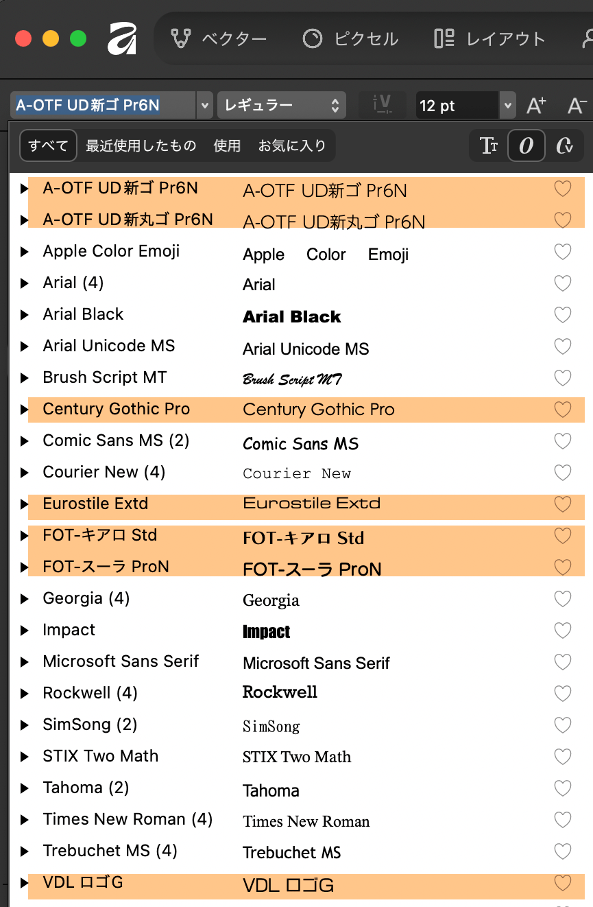 ただし、システムにインストールされる形ではなく、あくまでAffinityのアドオン的な挙動をするらしく、Affinity以外のアプリでは利用できません。また和文書体は含まれていません。