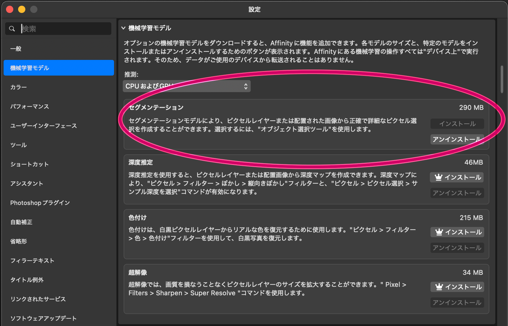 背景透過したい時にお世話になるのがPhotoshopの「オブジェクト選択ツール」ですが、Affinityにも完備されてます。ただ、予め設定から「セグメーション」をインストールしないと利用できないので注意。