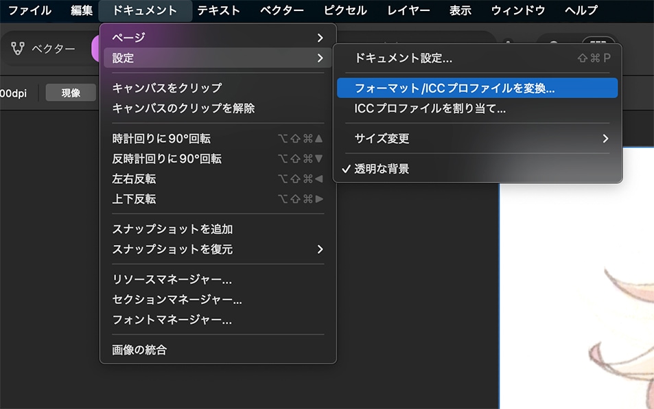 「ドキュメント→設定→フォーマット/ICCプロファイルを変換」で変換する方法と…