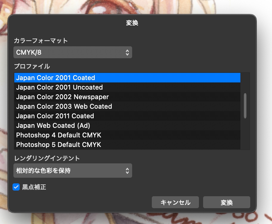 CMYKに変換する際には、カラーフォーマットを「CMYK/8」、プロファイルを「Japan Color 2001 Coated」(※日本のCMYK印刷の基本のプロファイル形式になります)とします。