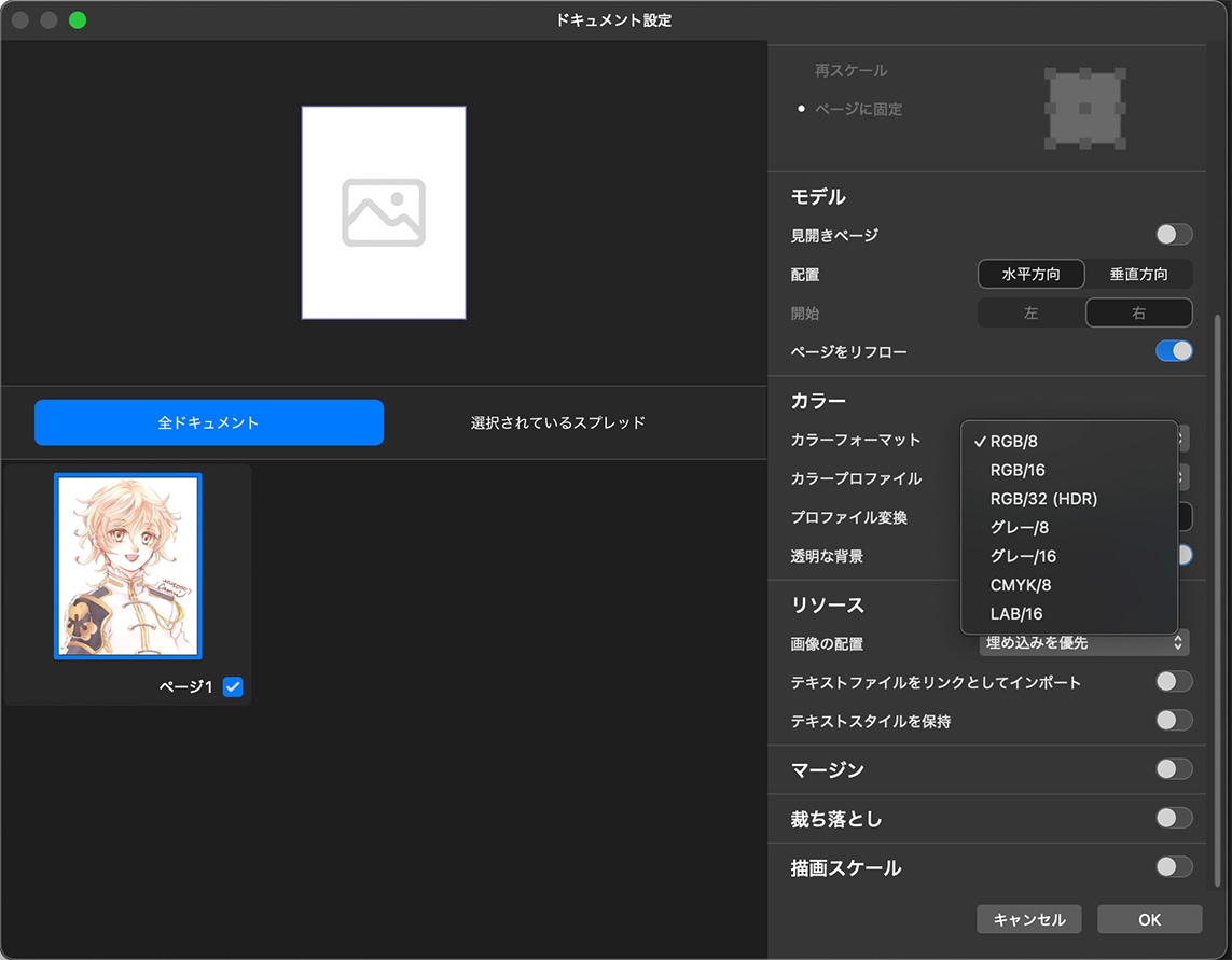 「ドキュメント→設定→ドキュメント設定」でドキュメント設定ダイアログを呼び出して、そこでカラーフォーマットとカラープロファイルを変更する方法とがあります。CMYK変換のみであればどちらを使ってもいいのですが、裁ち落としの設定とかもセットでやりたい場合は、後者の方法がスマートに作業できるかなと。