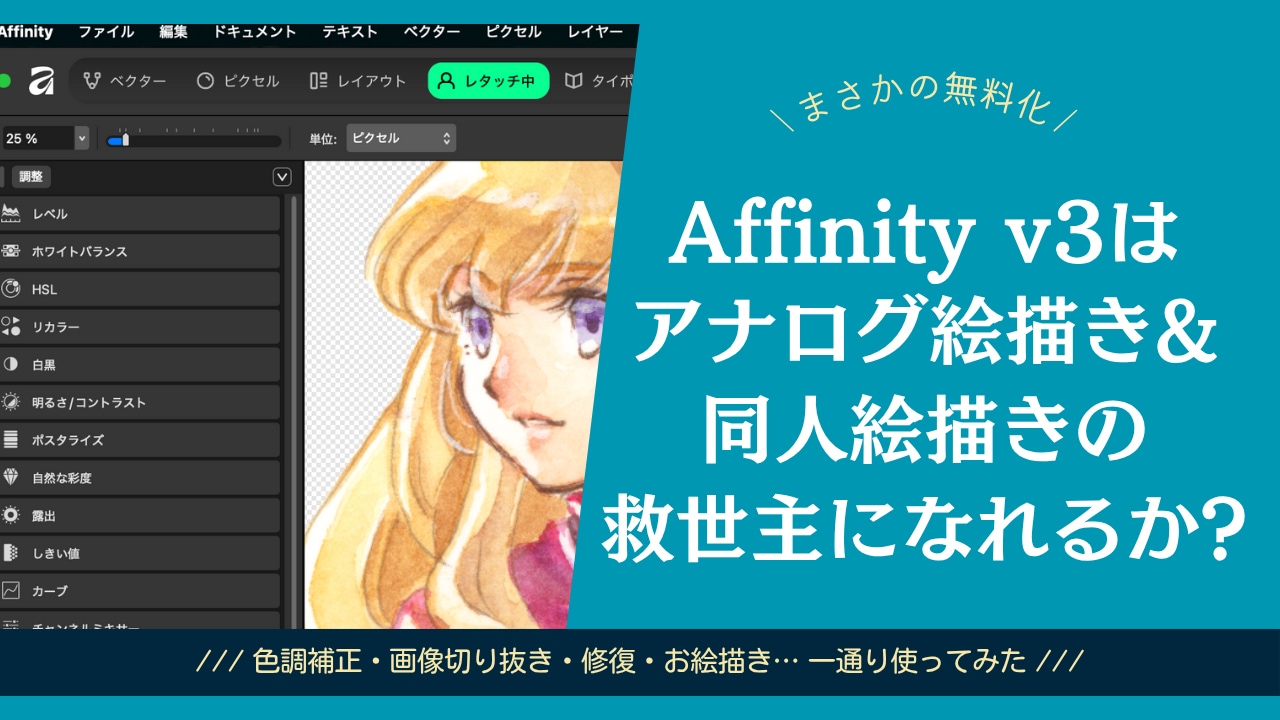 今回は大型アップデートにより実質無料化してしまった画像編集ソフト「Affinity by Canva」のご紹介と、アナログ絵描き&同人絵描きはAffinityと和睦できるのかどうか、実際に触りながらゆる〜く検証してみます。
