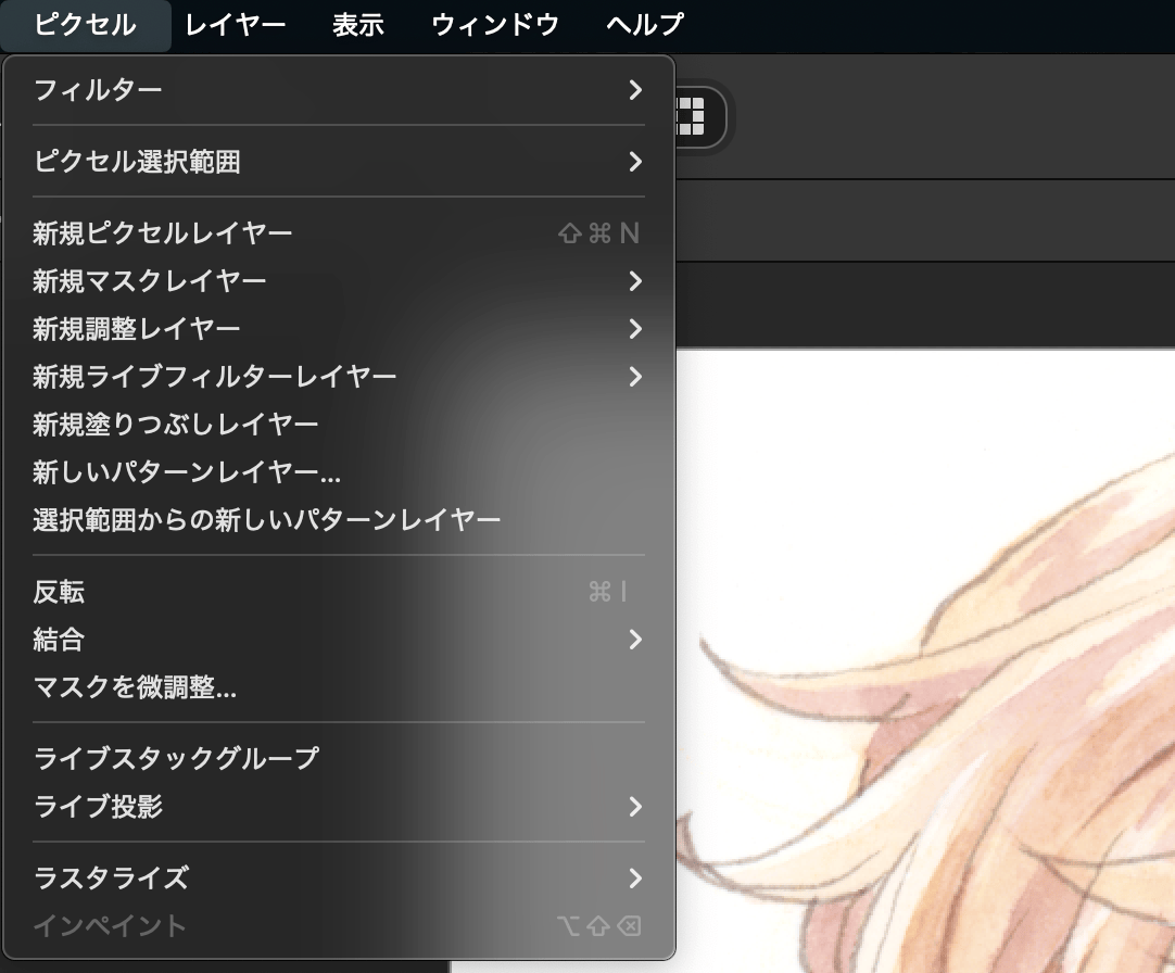 本記事はあくまでPhotoshopの代替になるかに焦点をあて、主にアナログ絵描きや同人絵描きが使う頻度が高そうであろう機能に絞っている為、旧Affinity Photoにあたる「ピクセルモード」および「レタッチモード」に限定した内容になっています。